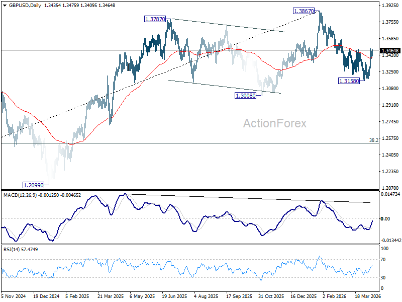 Intraday bias in GBP/USD stays neutral and more consolidations could be seen below 1.3483 temporary top. Fall from 1.3867 could have completed as a correction at 1.3158 already. Above 1.3483 will target 61.8% retracement of 1.3867 to 1.3158 at 1.3596. Firm break there will bring retest of 1.3867 high. Nevertheless, sustained break of 55 4H EMA (now at 1.3337) will dampen this bullish view and bring retest of 1.3158 instead.