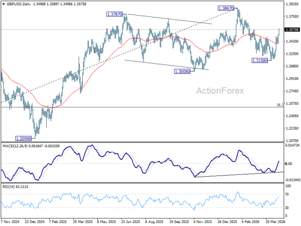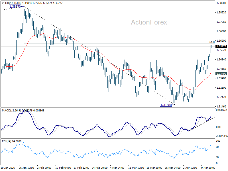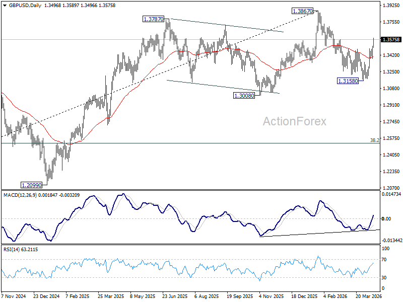 Intraday bias in GBP/USD remains on the upside for 61.8% retracement of 1.3867 to 1.3158 at 1.3596. Decisive break there will extend the rise from 1.3158 to retest 1.3867 high. For now, further rally will remain in favor as long as 1.3379 support holds, in case of retreat.
