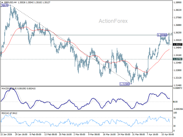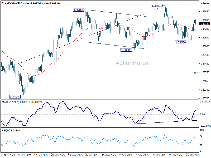 GBP/USD’s rebound from 1.3158 extended higher last week but failed to break through 61.8% retracement of 1.3867 to 1.3158 at 1.3596 decisively. Initial bias remains neutral this week first. On the upside, sustained break of 1.359 will pave the way to retest 1.3867 high. However, firm break of 1.3379 will bring deeper fall back to 1.3158 low instead.
