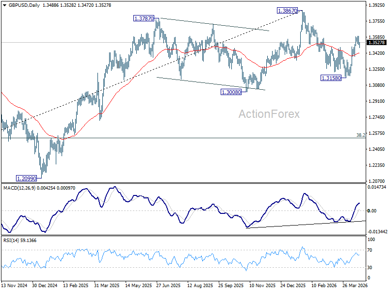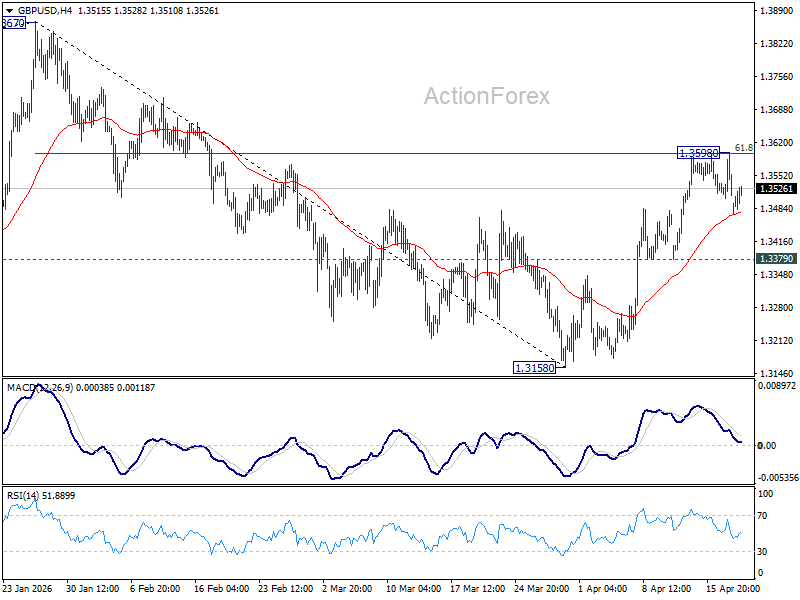 GBP/USD is still extending consolidations below 1.3598 and intraday bias remains neutral. Further rise is in favor as long as 1.3379 support holds. Sustained break of 61.8% retracement of 1.3867 to 1.3158 at 1.3596 will pave the way to retest 1.3867 high. However, firm break of 1.3379 will bring deeper fall back to 1.3158 low instead.