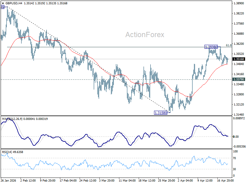 Intraday bias in GBP/USD remains neutral as it’s extending consolidations below 1.3598. With 1.3379 support intact, further rise is favor. On the upside, sustained break of 61.8% retracement of 1.3867 to 1.3158 at 1.3596 will pave the way to retest 1.3867 high. However, firm break of 1.3379 will bring deeper fall back to 1.3158 low instead.