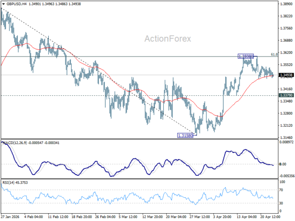 GBP/USD is still extending consolidations from 1.3598 and intraday bias remains neutral. With 1.3379 support intact, further rise is favor. On the upside, sustained break of 61.8% retracement of 1.3867 to 1.3158 at 1.3596 will pave the way to retest 1.3867 high. However, firm break of 1.3379 will bring deeper fall back to 1.3158 low instead.