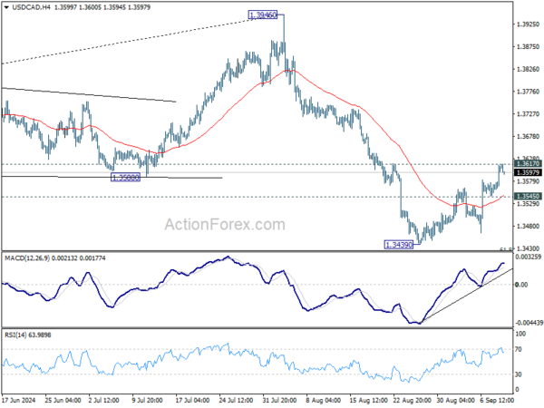 USD/CAD’s recovery is still limited by 1.3617 resistance and intraday bias remains neutral. Further decline will remain in favor as long as 1.3617 resistance holds. On the downside, below 1.3545 minor support will bring retest of 1.3439 low first. However, firm break of 1.3617 will turn bias back to the upside for stronger rebound instead.