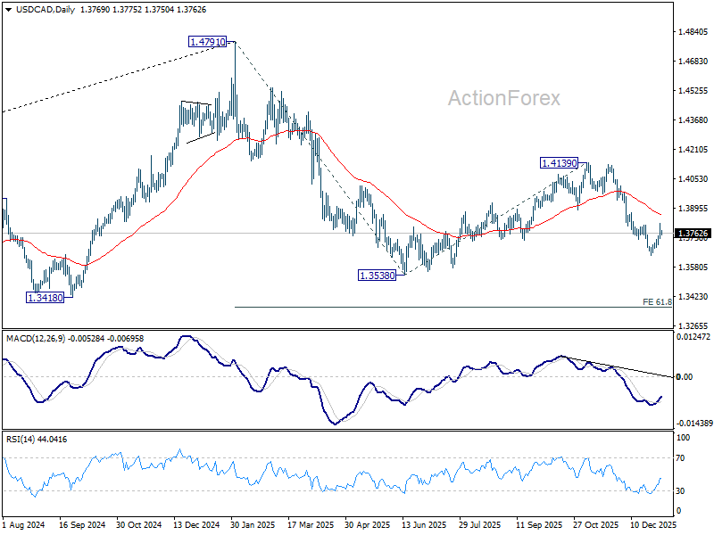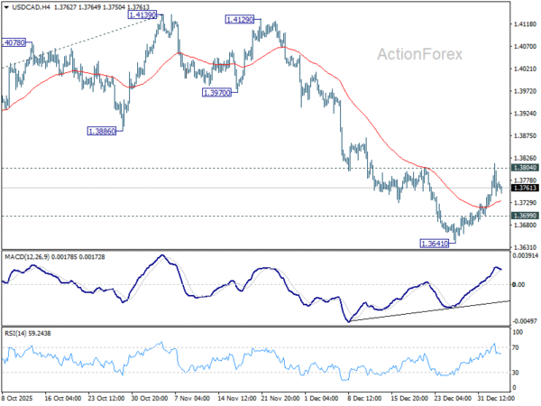 USD/CAD failed to break through 1.3804 resistance on first attempt and intraday bias stays neutral. On the upside, decisive break of 1.3804 will argue that fall from 1.4139 has completed. Stronger rebound should be seen back to 55 D EMA (now at 1.3857) and above. On the downside, below 1.3699 minor support will turn bias back to the downside. Break of 1.3641 will target 1.3538 low.