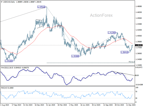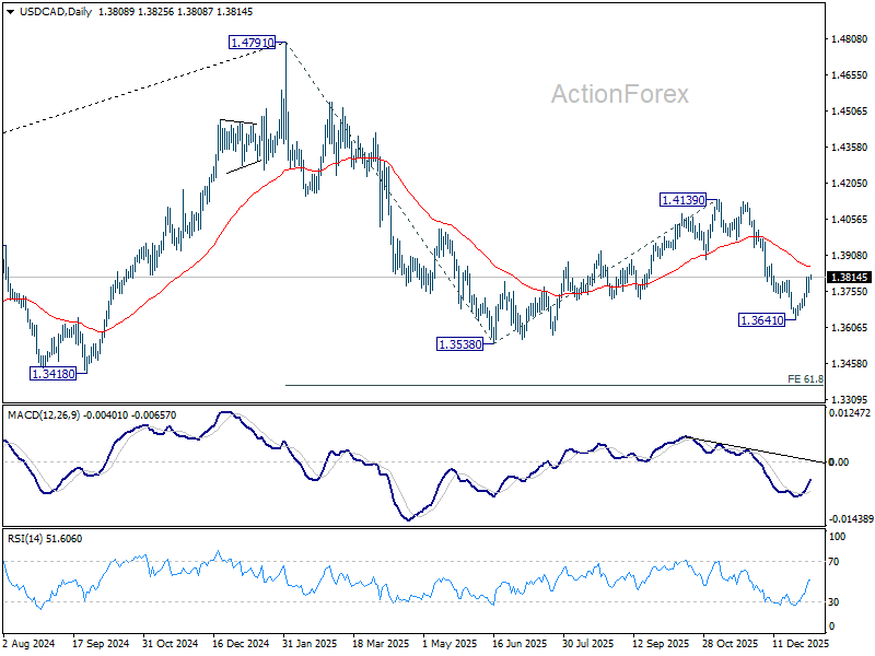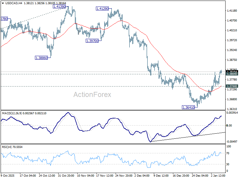USD/CAD’s break of 1.3804 resistance confirms short term bottoming at 1.3641. fall from 1.4139 might have completed. Intraday bias is back on the upside for 55 D EMA (now at 1.3857) and above. On the downside, below 1.3744 minor support will turn bias back to the downside for 1.3641.