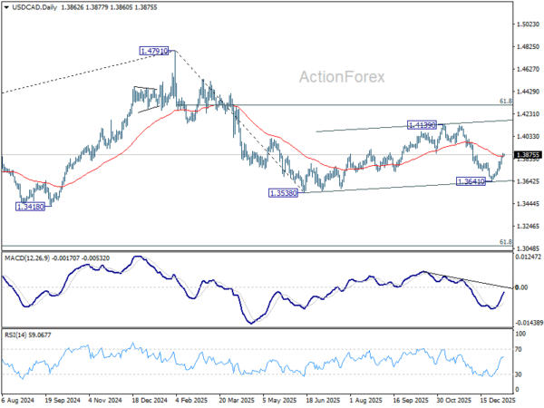 Intraday bias in USD/CAD remains on the upside as rise from 1.3641 is in progress. Corrective pattern from 1.3538 is extending, in its third leg. Sustained trading above 55 D EMA (now at 1.3859) will pave the way to 1.4139 resistance next. On the downside, below 1.3789 minor support will turn intraday bias neutral first.