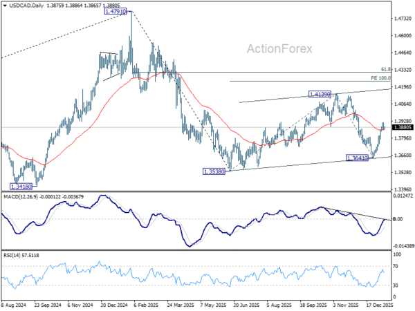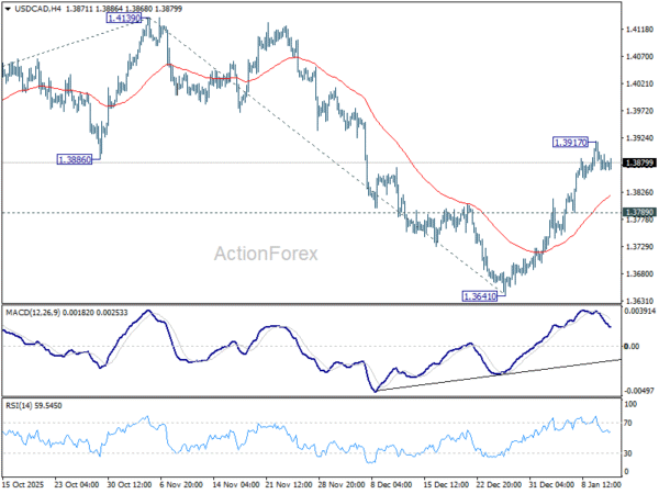 USD/CAD is staying in consolidations below 1.3917 temporary top and intraday bias remains neutral. Further rise is expected as long as 1.3789 minor support holds. Rise from 1.3641 is seen as the third leg of the corrective pattern from 1.3538. Above 1.3917 will target 1.4139 first. Break there will target 100% projection of 1.3538 to 1.4139 from 1.3641 at 1.4242.