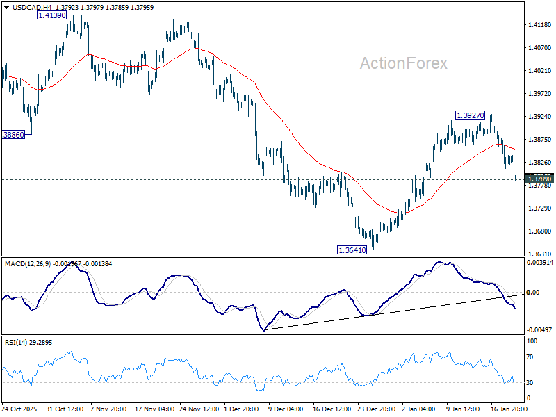 Immediate focus in on 1.3789 support as USD/CAD’s fall from 1.3927 accelerates lower. Firm break there will argue that rebound from 1.3641 has completed. Deeper decline should be seen back to 1.3538/3641 support zone. ON the upside, above 1.3927 will resume the rebound towards 1.4139 resistance. Overall price actions from 1.3538 are seen as a consolidation to the fall from 1.4791, and might still extend.