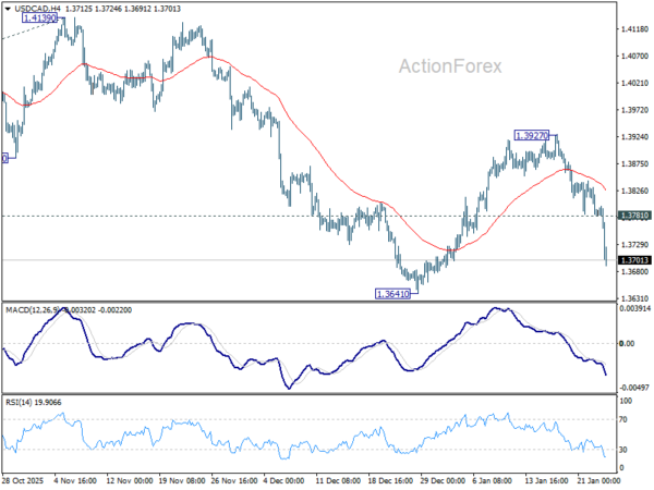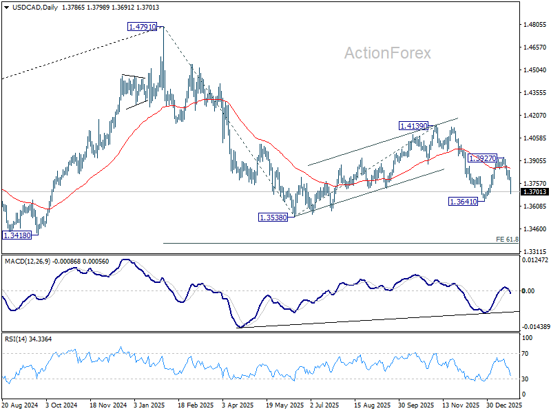 USD/CAD’s extended steep decline last week suggests that rebound from 1.3641 has completed at 1.3927 already. Initial bias stays on the downside this week for 1.3641 support first. Firm break there will target 1.3538 low. On the upside, above 1.3781 minor resistance will turn intraday bias neutral.