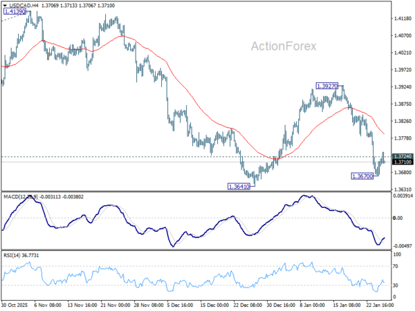 Intraday bias in USD/CAD is turned neutral with current recovery, and some consolidations would be seen above 1.3670 temporary low. Risk will stay on the downside as long as 55 4H EMA (now at 1.3788) holds. Below 1.3670 will bring retest of 1.3641 support. Firm break there will will resume the decline from 1.4139 and target a retest on 1.3538 low.