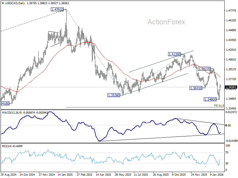 Breach of 55 4H EMA (now at 1.3663) suggests short term bottoming at 1.3480. Intraday bias is mildly on the upside for stronger rebound to 55 D EMA (now at 1.3800). On the downside, below 1.3623 minor support will bring retest of 1.3480 low. Firm break there will resume larger fall to 61.8% projection of 1.4791 to 1.3538 from 1.4139 at 1.3365.
