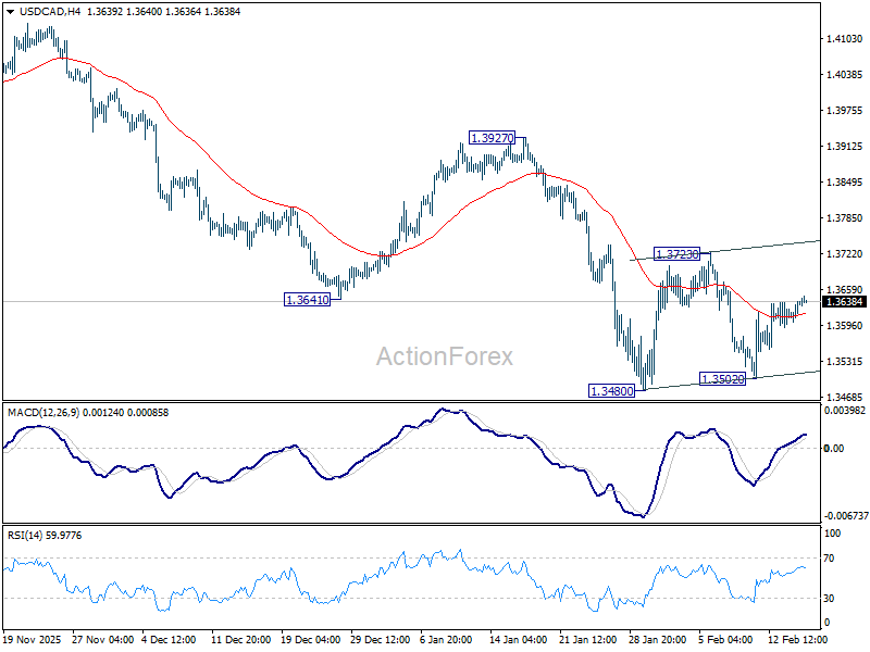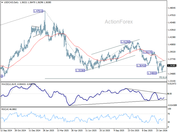 Intraday bias in USD/CAD remains neutral and more consolidations would be seen above 1.3480. While stronger rebound cannot be ruled out, upside should be limited by 55 D EMA (now at 1.3744) to complete the pattern. On the downside, firm break of 1.3480 will resume larger down trend from 1.4791 to 61.8% projection of 1.4791 to 1.3538 from 1.4139 at 1.3365.