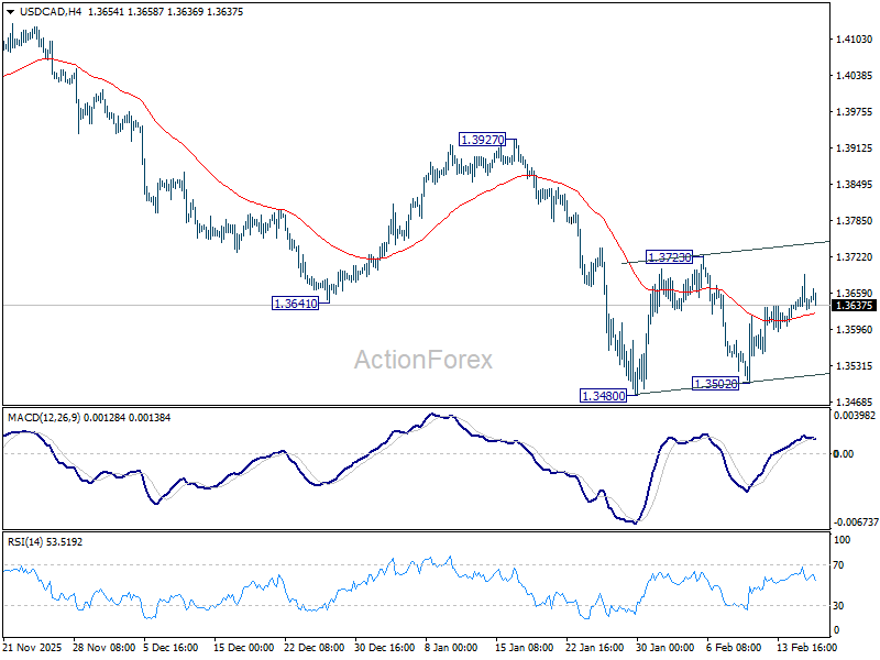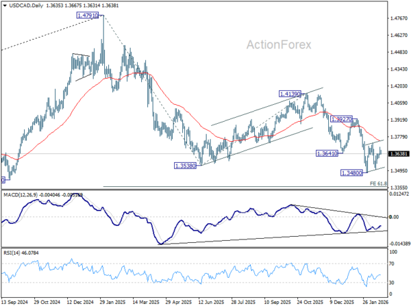 USD/CAD is still extending consolidations pattern from 1.3480 and intraday bias remains neutral. While stronger rebound cannot be ruled out, upside should be limited by 55 D EMA (now at 1.3744) to complete the pattern. On the downside, firm break of 1.3480 will resume larger down trend from 1.4791 to 61.8% projection of 1.4791 to 1.3538 from 1.4139 at 1.3365.