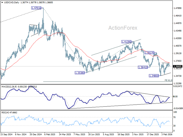 Intraday bias in USD/CAD remains neutral at this point. Consolidations from 1.3480 is in progress and stronger rebound might be seen. But upside should be limited by 55 D EMA (now at 1.3730) to complete the pattern. On the downside, below 1.3630 minor support will bring retest of 1.3480 low. Firm break there will resume larger down trend from 1.4791 to 61.8% projection of 1.4791 to 1.3538 from 1.4139 at 1.3365. However, sustained break of 55 D EMA will bring further rise to 1.3927 resistance and above.