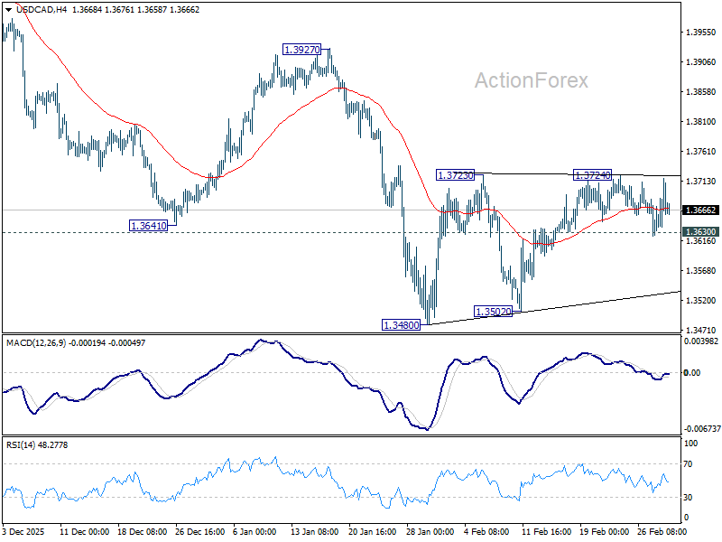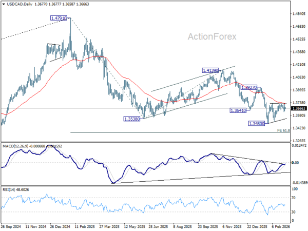 No change in USD/CAD and intraday bias remains neutral. Consolidations pattern from 1.3480 could extend. But upside should be limited by 55 D EMA (now at 1.3724). On the downside, firm break of 1.3630 minor support will bring retest of 1.3480 low first. Decisive break there will resume larger down trend 1.4791 to 61.8% projection of 1.4791 to 1.3538 from 1.4139 at 1.3365. However, decisive break of 55 D EMA will bring stronger rebound to 1.3927 resistance instead.