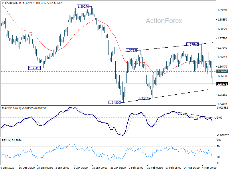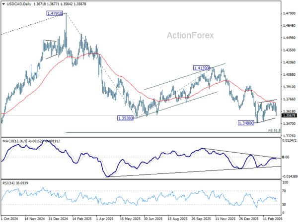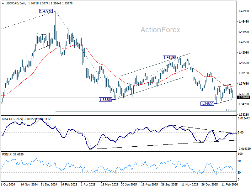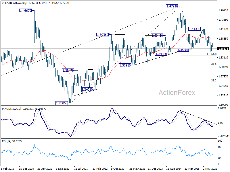 USD/CAD’s late decline last week suggests that consolidation pattern from 1.3480 has completed with three waves up to 1.3751, after hitting 55 D EMA (now at 1.3714). Initial bias is back on the downside this week for retesting 1.3480 low first. Firm break there will confirm resumption of whole fall from 1.4791, and target 61.8% projection of 1.4791 to 1.3538 from 1.4139 at 1.3365. For now, near term outlook will remain bearish as long as 1.3751 resistance holds, in case of recovery.
