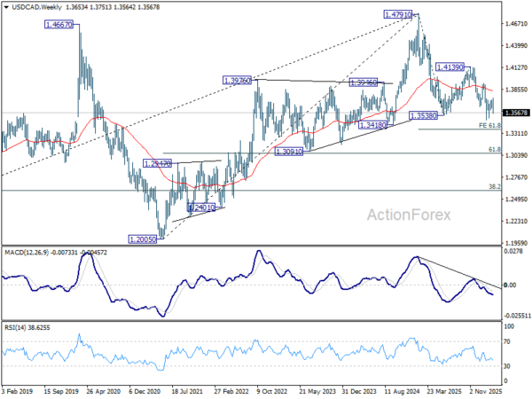 In the bigger picture, price actions from 1.4791 are seen as a corrective pattern to the whole up trend from 1.2005 (2021 low). Deeper fall could be seen, as the pattern extends, to 61.8% retracement of 1.2005 to 1.4791 at 1.3069. For now, medium term outlook will be neutral at best, until there are signs that the correction has completed, or that a bearish trend reversal is confirmed.