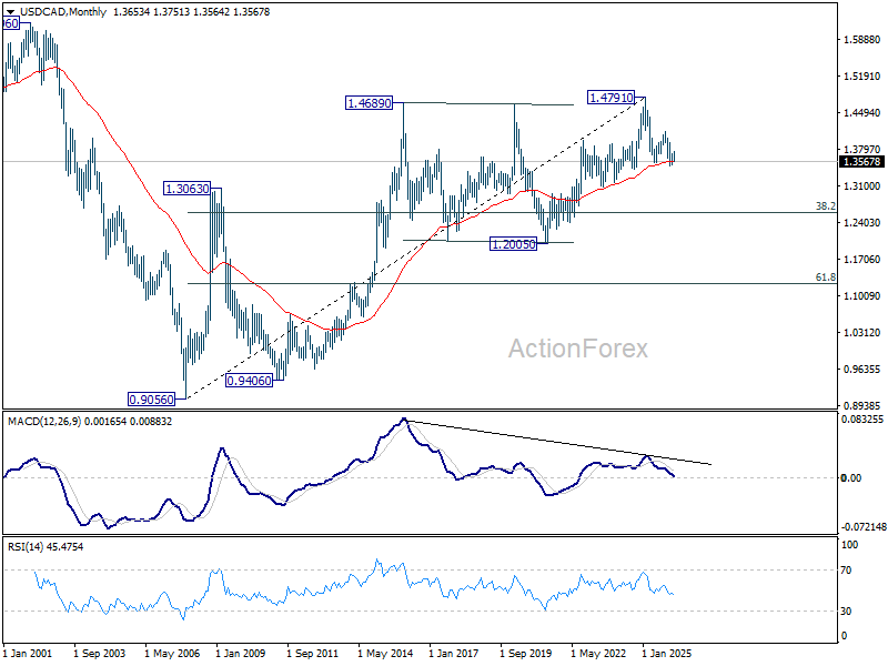 In the long term picture, rising 55 M EMA (now at 1.3569) remains intact. Thus, up trend from 0.9056 (2007 low) could still be in progress. However, considering bearish divergence condition M MACD, sustained trading below 55 M EMA will argue that the up trend has completed with five waves up to 1.4791, and turn medium term outlook bearish for correction to 38.2% retracement of 0.9056 to 1.4791 at 1.2600.