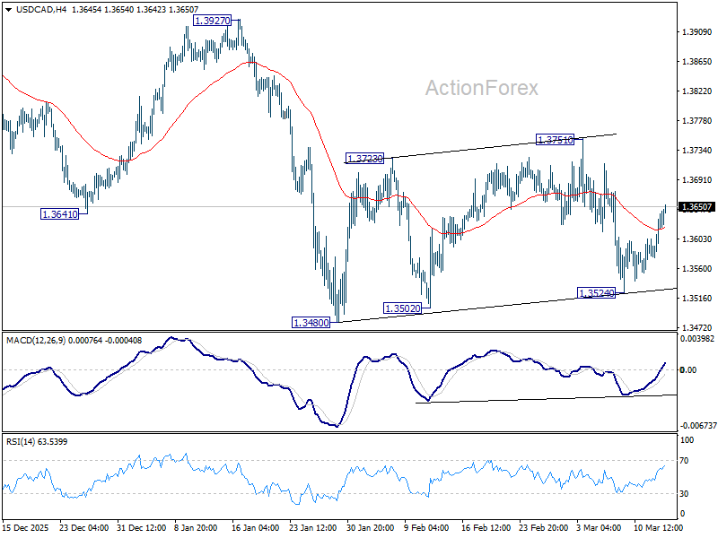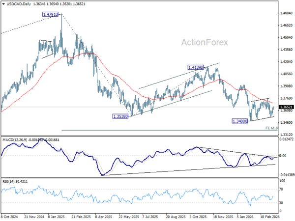 While USD/CAD’s rebound from 1.3524 extends, it’s still bounded in established near term range. Intraday bias remains neutral and outlook stays bearish with 1.3571 resistance intact. On the downside, firm break of 1.3480 low will confirm resumption of whole fall from 1.4791, and target 61.8% projection of 1.4791 to 1.3538 from 1.4139 at 1.3365. However, sustained break of 1.3751 will indicate that larger scale corrective bounce is underway.