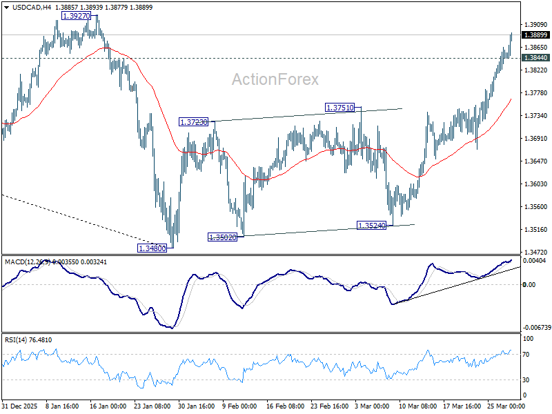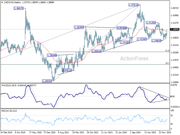 USD/CAD’s rebound from 1.3480 accelerated high last week. Initial bias stays on the upside this week for 38.2% retracement of 1.4791 to 1.3480 at 1.3981. Decisive break there will argue that it’s already reversing the whole down trend from 1.4791, and target 61.8% retracement at 1.4290. On the downside, below 1.3844 minor support will turn intraday bias neutral first. But risk will stay on the upside as long as 1.3751 resistance turned support holds, in case of retreat.