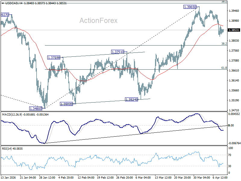 Intraday bias in USD/CAD remains neutral and more consolidations could be seen below 1.3965. As long as 38.2% retracement of 1.3840 to 1.3965 at 1.3780 holds, further rally is in favor. Break of 1.3965 will resume whole rise from 1.3480. However, sustained break of 1.3780 will argue that the rebound from 1.3840 has completed, and bring deeper decline to 61.8% retracement at 1.3665 and below.