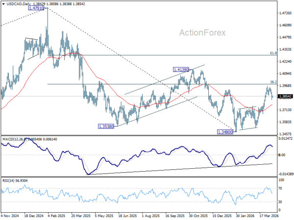 Daily Pivots: (S1) 1.3813; (P) 1.3857; (R1) 1.3889; More…
