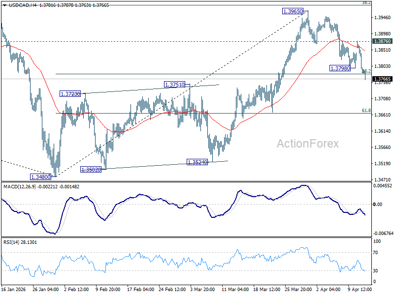 USD/CAD’s fall from 1.3965 resumed by breaking through 1.3798 temporary low. Intraday bias is back on the downside. Sustained trading below 38.2% retracement of 1.3840 to 1.3965 at 1.3780 will argue that the rebound from 1.3840 has completed, and bring deeper decline to 61.8% retracement at 1.3665 and below. On the upside, above 1.3876 resistance will turn bias neutral again first.