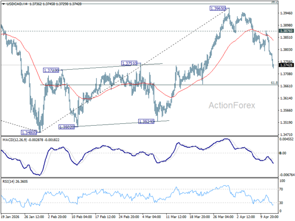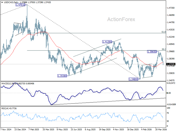 Intraday bias in USD/CAD remains on the downside for 61.8% retracement of 1.3480 to 1.3965 at 1.3665. Decisive break there will extend the decline from 1.3965 to retest 1.3480 low. For now, risk will stay on the downside as long as 1.3876 resistance holds, in case of recovery.
