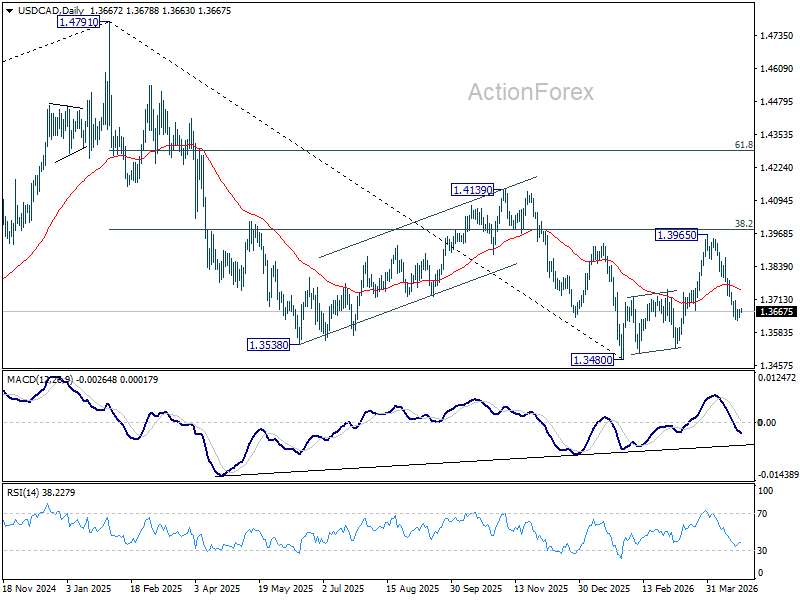 Intraday bias in USD/CAD is turned neutral again with current recovery. Further fall is in favor as long as 1.3787 resistance holds. Sustained trading below 61.8% retracement of 1.3480 to 1.3965 at 1.3665 will pave the way to retest 1.3480 low. However, firm break of 1.3787 will bring stronger rebound back to retest 1.3965 resistance.