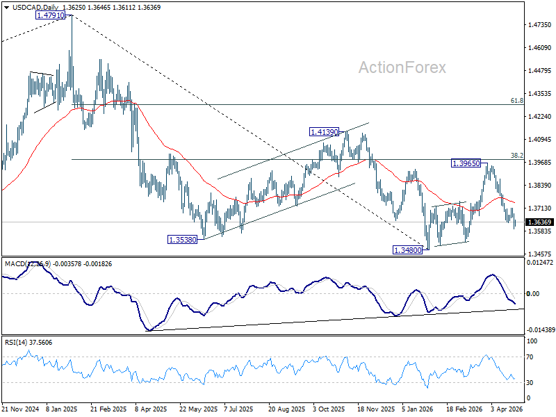 Intraday bias in USD/CAD remains on the downside for the moment. Fall from 1.3965 should target a retest of 1.3480 low. Firm break there will resume larger down trend. For now, risk will stay on the downside as long as 1.3713 resistance holds, in case of recovery