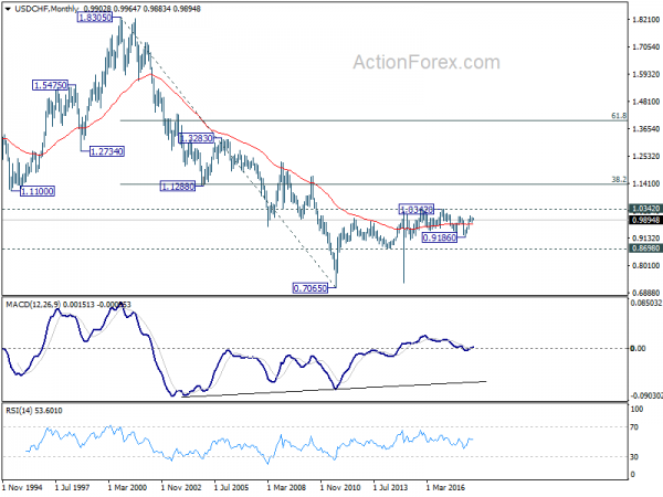 In the bigger picture, rise from 0.9186 is seen as a leg inside the long term range pattern. For now, further rise is expected as long as 38.2% retracement of 0.9186 to 1.0056 at 0.9724 holds. Above 1.0056 will target 1.0342 (2016 high). In that case, we’d be cautious on strong resistance from 1.0342 to limit upside. However, sustained break of 0.9724 will dampen this bullish view and would at least bring deeper fall to 61.8% retracement at 0.9518.