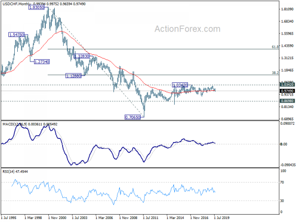 In the bigger picture, up trend from 0.9186 (2018 low) should have completed at 1.0237 already. Deeper decline would be seen to 61.8% retracement of 0.9186 to 1.0237 at 0.9587 and below. For now, USD/CHF is seen as in long term range pattern between 0.9186 and 1.0342. Hence, we’d pay attention to bottoming signal below 0.9587. Nevertheless, break of 0.9975 resistance is needed to indicate completion of the decline from 1.0237. Otherwise, risk will stay on the downside.