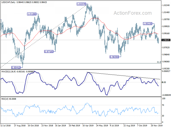 In the bigger picture, medium term outlook remains neutral as USD/CHF is staying in range of 0.9659/1.0237. In any case, decisive break of 1.0237 is needed to indicate up trend resumption. Otherwise, more sideway trading would be seen with risk of another fall. Meanwhile, break of 0.9695 support will target 0.9541 support instead.