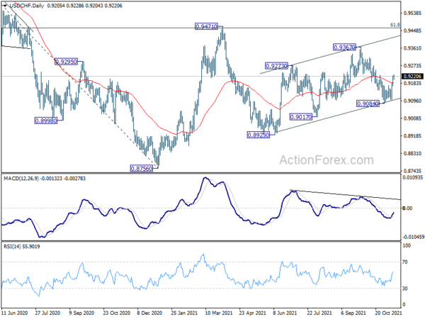 Intraday bias in USD/CHF stays on the upside as rebound from 0.9084 short term bottom is in progress. Further rise would be seen back to retest 0.9367 resistance. On the downside, below 0.9172 minor support will turn intraday bias back to the downside for 0.9084 instead.