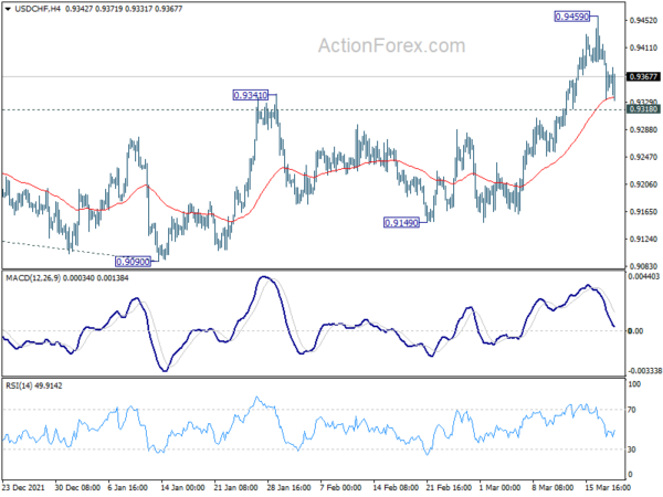 Intraday bias in USD/CHF remains neutral at this point. As long as 0.9318 support holds, further rally is still expected. On the upside, above 0.9459 will target 0.9471 resistance first. Break there will resume whole rally from 0.8756 to 61.8% projection of 0.8756 to 0.9471 from 0.9090 at 0.9532. However, break of 0.9318 will bring deeper pull back to 55 day EMA (now at 0.9242).