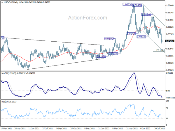 A temporary low is formed at 0.9369 in USD/CHF and intraday bias is turned neutral for some consolidations. Upside of recovery should be limited below 0.9648 resistance to bring another decline. Break of 0.9369 will resume larger fall to 100% projection of 0.9884 to 0.9468 from 0.9648 at 0.9232.