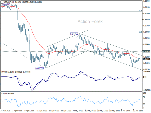 Intraday bias in USD/CHF remains neutral at this point. On the upside, break of 0.8247 resistance will argue that corrective pattern from 0.8038 is starting the third leg. Bias will be turned back to the upside for 0.8475 resistance again. However, firm break of 0.8038 will resume larger down trend. Next target will be 61.8% projection of 0.9200 to 0.8038 from 0.8475 at 0.7757.