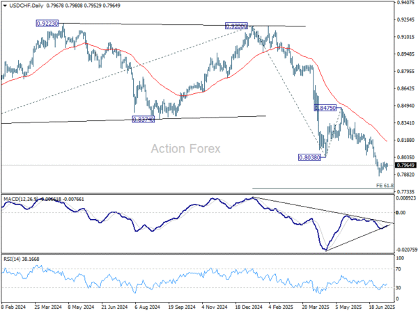 USD/CHF stayed in consolidations above 0.7871 last week and outlook is unchanged. Initial bias remains neutral this week first. Stronger recovery might be seen but upside should be limited by 0.8054 support turned resistance. On the downside, firm break of 0.7871 will extend the larger down trend to 61.8% projection of 0.9200 to 0.8038 from 0.8475 at 0.7757.