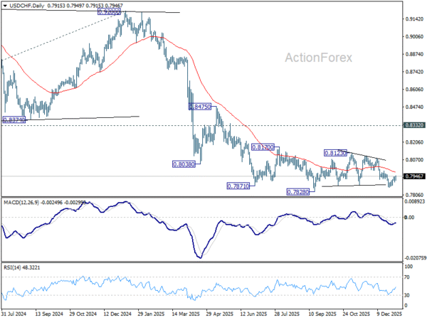 USD/CHF’s rebound from 0.7860 extends today. But upside is capped well below 0.7986 resistance. Intraday bias remains neutral for the moment. On the downside, below 0.7900 minor support will turn bias to the downside. Break of 0.7860 will target a retest on 0.7828 low. However, break of 0.7986 will argue that corrective pattern from 0.7828 is still extending with another rising leg already in progress.