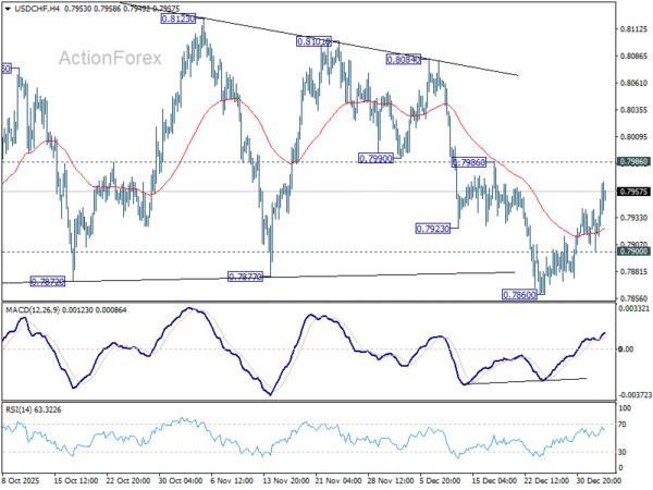 Intraday bias in USD/CHF remains neutral for the moment. On the downside, below 0.7900 minor support will turn bias to the downside. Break of 0.7860 will target a retest on 0.7828 low. However, break of 0.7986 will argue that corrective pattern from 0.7828 is still extending with another rising leg already in progress.