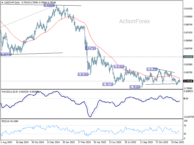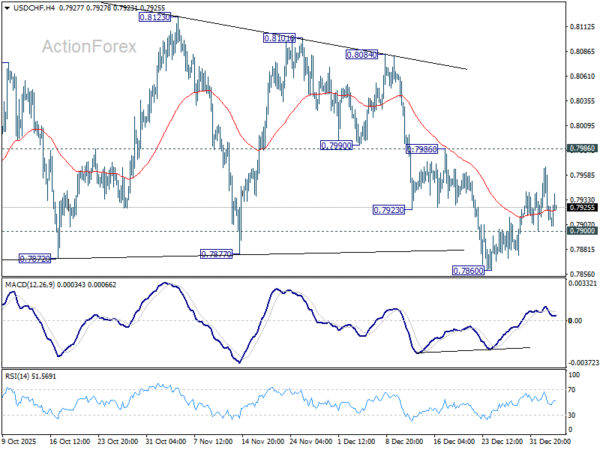 Intraday bias in USD/CHF stays neutral for the moment. Further decline is mildly in favor with 0.7986 resistance intact. On the downside, below 0.7900 minor support will turn bias to the downside. Break of 0.7860 will target a retest on 0.7828 low. However, break of 0.7986 will argue that corrective pattern from 0.7828 is still extending with another rising leg already in progress.
