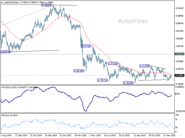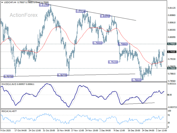 Intraday bias in USD/CHF stays neutral and further decline is mildly in favor with 0.7986 resistance intact. On the downside, below 0.7900 minor support will turn bias to the downside. Break of 0.7860 will target a retest on 0.7828 low. However, break of 0.7986 will argue that corrective pattern from 0.7828 is still extending with another rising leg already in progress.