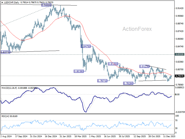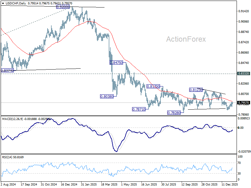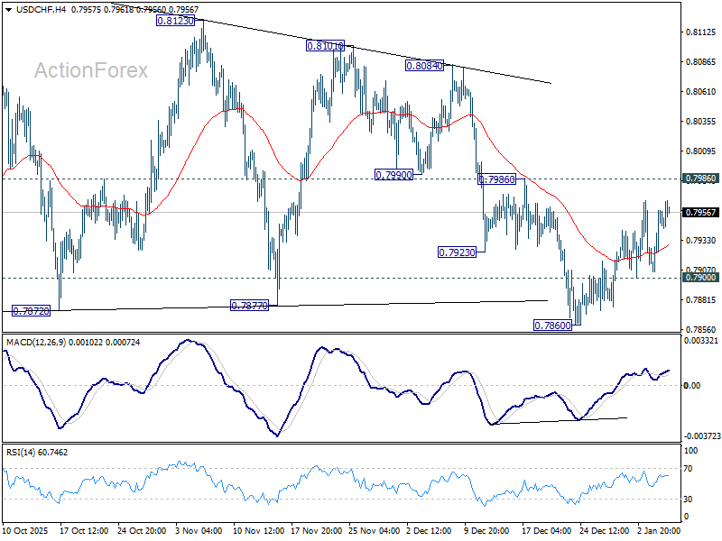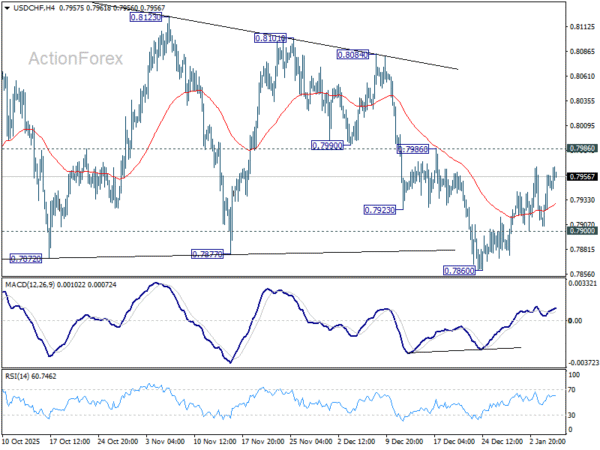 No change in USD/CHF’s outlook and intraday bias remains neutral at this point. Further decline is mildly in favor with 0.7986 resistance intact. On the downside, below 0.7900 minor support will turn bias to the downside. Break of 0.7860 will target a retest on 0.7828 low. However, break of 0.7986 will argue that corrective pattern from 0.7828 is still extending with another rising leg already in progress.