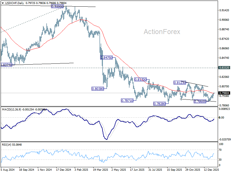 Immediate focus is now on 0.7986 resistance as USD/CHF’s rebound from 0.7860 extends today. Firm break there will will argue that corrective pattern from 0.7828 is still extending with another rising leg already in progress. Bias will be turned back to the upside for 0.8123 resistance. Nevertheless, on the downside, below 0.7905 support will turn bias to the downside. Break of 0.7860 will target a retest on 0.7828 low.