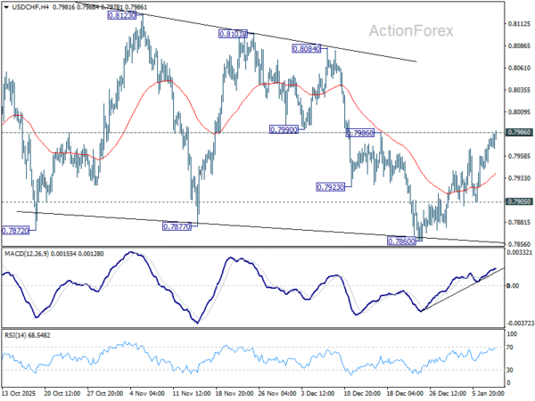 Focus remains on 0.7986 resistance in USD/CHF. Firm break there will argue that corrective pattern from 0.7828 is still extending with another rising leg already in progress. Bias will be turned back to the upside for 0.8123 resistance. Nevertheless, on the downside, below 0.7905 support will turn bias to the downside. Break of 0.7860 will target a retest on 0.7828 low.
