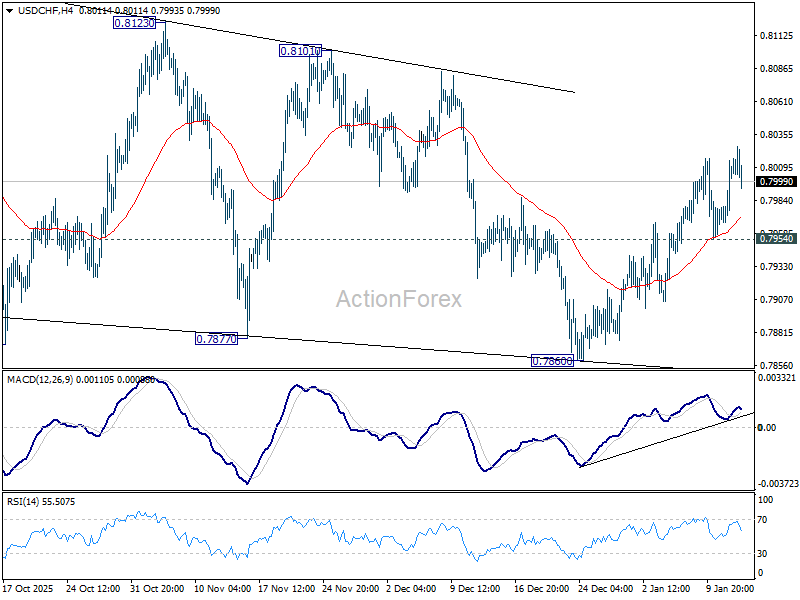 Intraday bias in USD/CHF stays mildly on the upside for the moment. Rebound from 0.7860 would target 0.8123 resistance. On the downside, below 0.7954 support will turn intraday bias neutral again first. Overall, corrective pattern from 0.7828 low is in progress and would extend further.