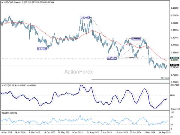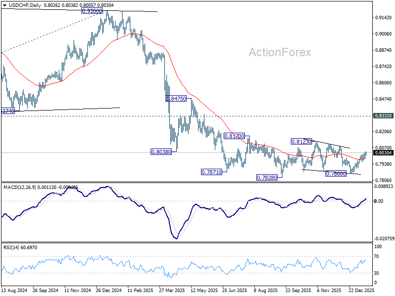 USD/CHF’s rise from 0.7860 continued last week even though momentum hasn’t been too convincing. Initial bias stays on the upside this week for 0.8123 resistance. On the downside, below 0.7983 minor support will turn bias neutral first. Overall, corrective pattern from 0.7828 is extending.