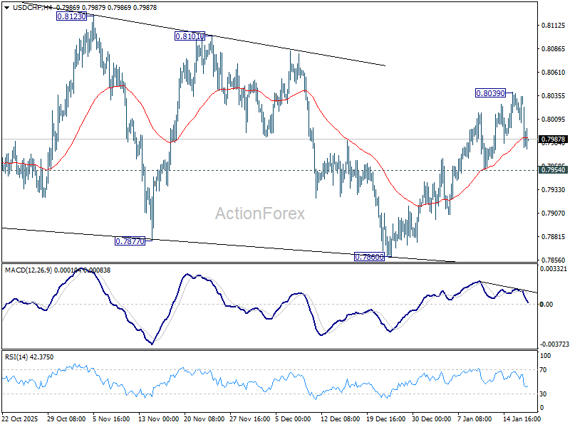 Intraday bias in USD/CHF is turned neutral again with current retreat. On the upside, break of 0.8039 will resume the rally from 0.7860 for 0.8123 resistance However, break of 0.7954 support will argue that the rebound has completed, and turn bias back to the downside for 0.7860. Overall, corrective pattern from 0.7828 is extending.
