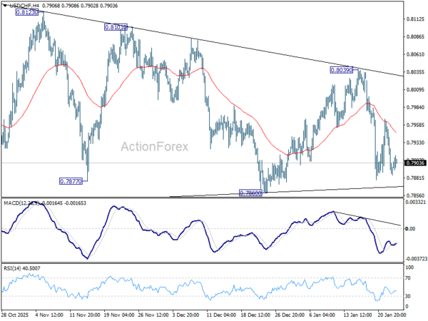 Sideway trading continues in USD/CHF and intraday bias remains neutral. Also, risk stays on the downside with 55 4H EMA (now at 0.7948) intact. Firm break of 0.7860 support will argue that larger down trend is ready to resume through 0.7828 low. Nevertheless, sustained break of 55 4H EMA will bring stronger rebound towards 0.8039 resistance. Overall, price actions from 0.7828 are seen as a corrective pattern, which could still extend.