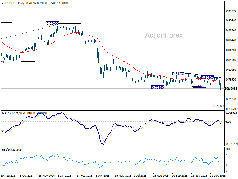 USD/CHF’s steep decline and break of 0.7828 low last week confirms long term down trend resumption. Initial bias stays on the downside this week. Next target is 0.7382 projection level. On the upside, above 0.7878 minor resistance will turn intraday bias neutral first. But recovery should be limited well below 0.8039 resistance to bring another fall.